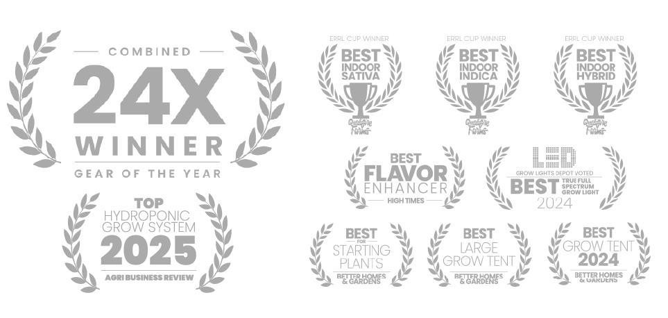 Text 'The Most Awarded Indoor Grow Equipment' in gray on a white background