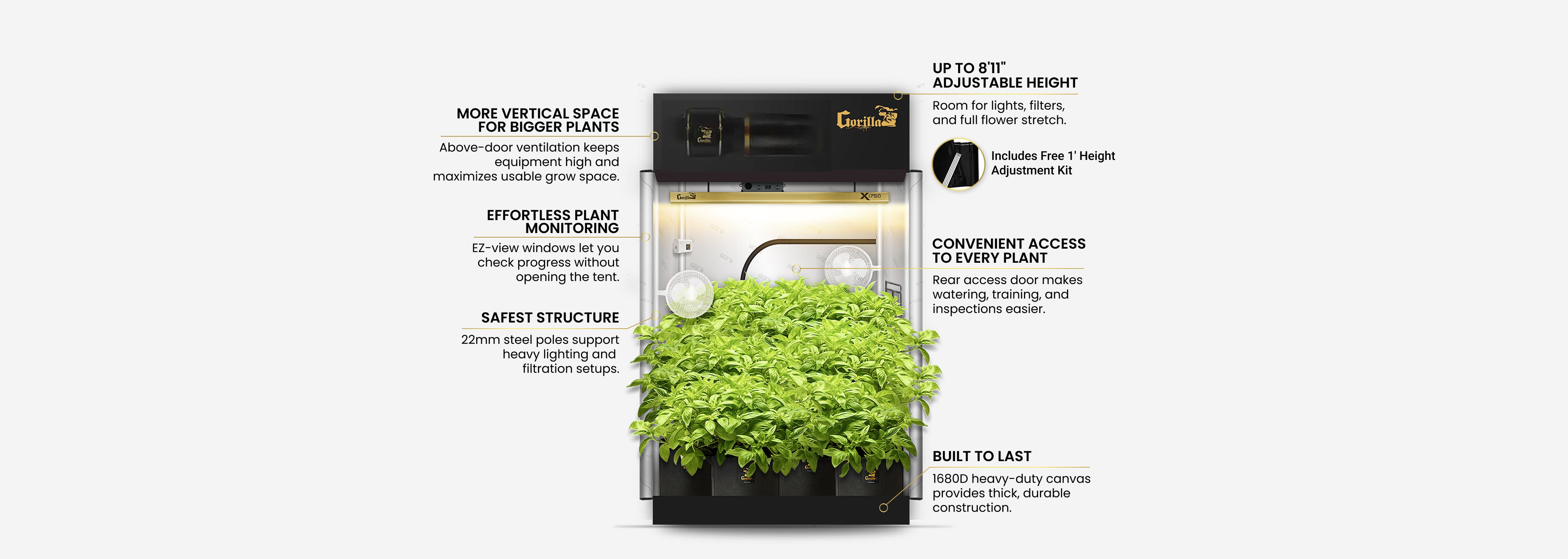 How tall can a Gorilla Grow Tent be? Gorilla Grow Tents come with a height extension kit, allowing you to extend the tent’s height by up to 2 feet.